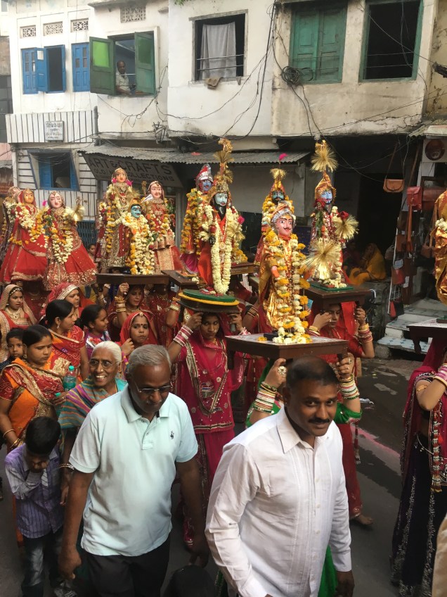 The next day would be my last in the city before heading back north toward Jaipur, but not before celebrating Mewar. India notoriously has a multitude of holidays, festivals, and celebrations, some only celebrated in certain cities. I was not aware of Mewar when I arranged my travel, but it was inevitable that I would run head on into a festival at some time or another so it was not a surprise. Mewar celebrates the arrival of spring. Women dressed in traditional attire parade through the streets, balancing homemade idols of Lord Shiva or Goddess Parvati on their heads, and chanting Rajasthani folk songs. Married women pray to the idol for good health for their families. Single women pray for a good match in marriage. They carry the idols to Lake Pichola where they are set afloat on designated boats to the delight of the gathering crowd. It goes on for hours and was immersive to be enveloped by the rhythmic percussion of the music and the blanket of floating saris.