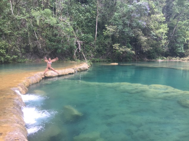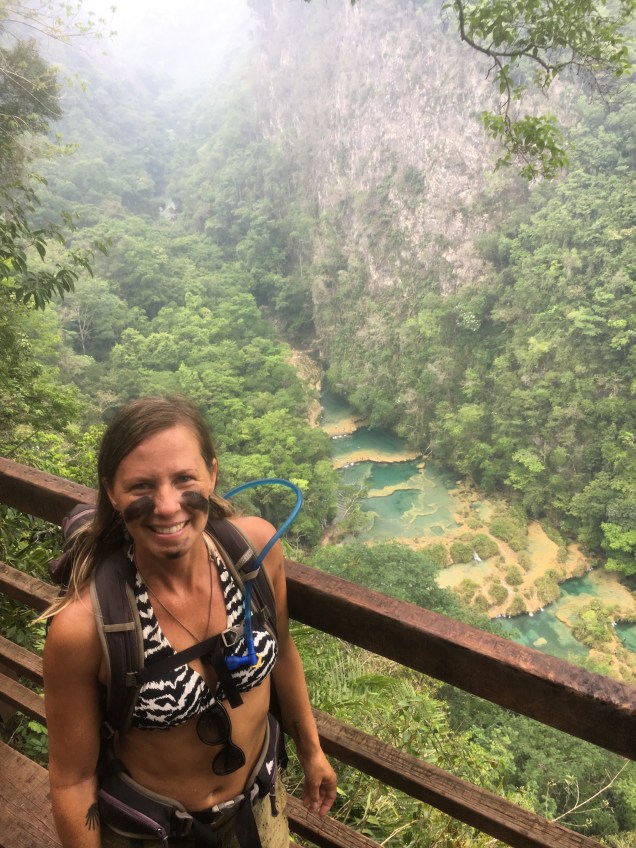 We walked to a waterfall and some people jumped into the river on a rope swing. We floated down the Cahabón River in inner tubes and pre-teen boys would paddle out to us with floating coolers of beer trying to make a sale. Many of us didn’t have any money while we were in the water and they said that was ok; we could pay them when we got back to land. We hiked to El Mirador and this was our first view of the famous pools. From this height, it looked like a turquoise-adorned bracelet.