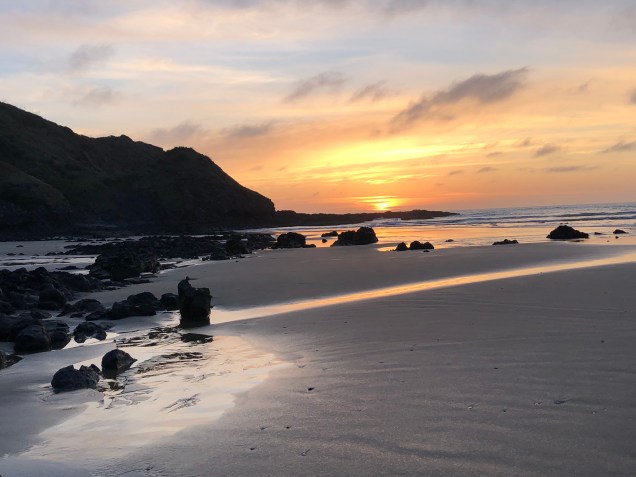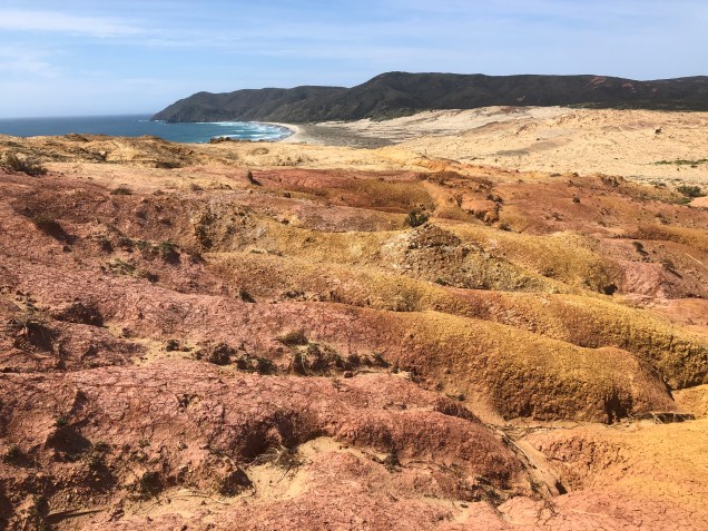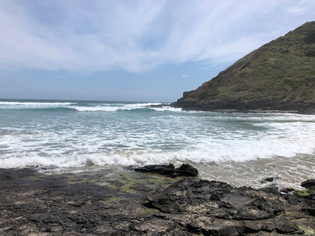 Undulating bluffs, apricot-colored mounds, and aquamarine waves were my views until I came to a patch of scraggy black rock, the swells crashing into my path. I tucked my knees up and bit my lip. My options were to retreat and try to find higher ground, although I could only see cliffs jutting up above, or to wait for the tide to go down, however long that may be. Was it coming in or going out? I couldn’t be sure. It seemed that I sat there for ages trying to decide what to do, long enough that I could feel the pattern of the waves, one small one, two medium ones, and then a big one, repeat. If I could time it right, I just might be able to scramble myself out of this between the big and small waves. With a little dexterity and channeling my inner ninja, hand over foot, I scaled the rocks and easily leapt to the other side. I looked back where I had been sitting and scoffed at the trepidation. I’ve got this, I thought.