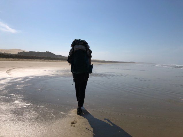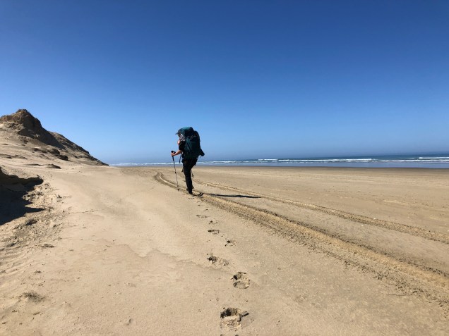 The next two days were more of the same, but darker. I took to stabbing my trekking poles into the spongy sand (shock absorption caused them to cheerily bounce back as if nothing had happened, which is very unsatisfying when you’re angry, like slamming a soft close door) and yelling “FUCK YOU, BEACH!” There was no one to hear me. “I hate this FUCKing beach!!” “And why does it SMELL? ARGH, it smells SO BAD!” I grew monstrous festering blisters and developed a heat rash around my waist. I was sunburned and thirsty. I played a game of stopping for a drink every 15 mins and allowed myself a proper break every two hours where I would eat a snack. Time became abstract. At the end of the third day, I had just taken my last sip of the 3 liters of water I carried when a pickup truck drove straight toward me. A woman rolled down her window like a mirage and introduced herself as Tania. She said, “My place is just up ahead with the green flag on the bluff. You’re welcome to stay if you’d like.” I just nodded, uncertain if she was real. She said she had a warm shower waiting for me. She turned to drive back where she had come from when she asked how I was doing on water. I told her it was gone and she poured the rest of her own bottle into mine. When her truck disappeared again and I could see I had only about 500 more meters to go, I cried for the first time. Sobs erupted from somewhere deep inside. The beach was defeating me and I hated it. I’m not easily defeated. When I had exhausted whatever demons had caused this outburst, I wiped my eyes, blew my nose, and did the only thing I could do. I kept walking.