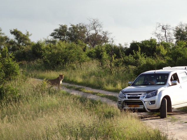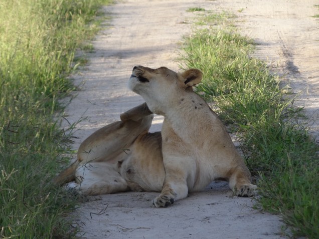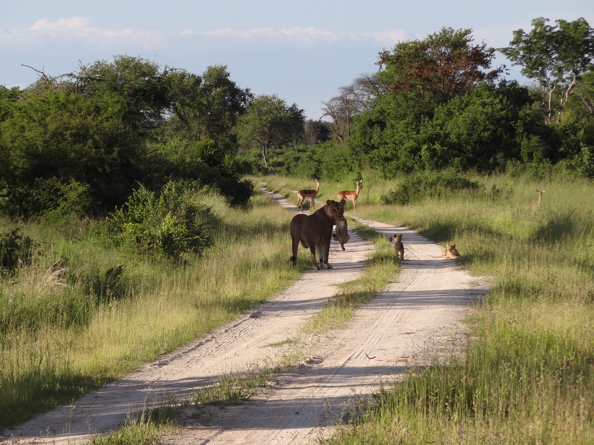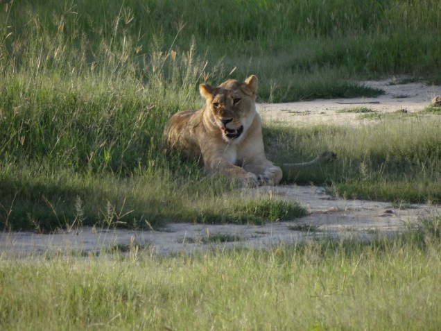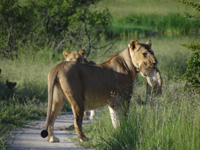 After driving around in a big arc, we returned to the same spot and even though the beautiful cat was still there, the shadows had grown longer and it was almost impossible to distinguish her spots in the dark. Our safari was drawing to a close so it was time to start the journey back toward camp. Seeing the leopard, even if only for a minute, had reinvigorated our lethargic tour and we were boisterously recounting her dart into the bush and sharing the one or two photos that we had snapped in her brief visibility. I was staring straight ahead, smiling to myself, when I saw them. I would have thought it to be impossible if I wasn’t seeing it with my own eyes. What luck!!! A lioness and three tiny cubs casually sauntered in the road. She was carrying one in her mouth and the other two followed closely behind. In contrast to the jittery leopard, this confident lioness stopped, turned to look at us, and calmly continued on her way. We trailed her at a slow pace, but she didn’t seem to be bothered by us at all. A group of impala saw her coming and they anxiously kept a fair distance, but she was with her babies; this was not a hunting posture. From my experience on nine safaris so far, I had learned that lions and leopard, in particular, don’t like to stay in the grass after a rain for the uncomfortable sensation of having wet feet so our luck of seeing all these beautiful felines in the road, was quite possibly because of the rain.