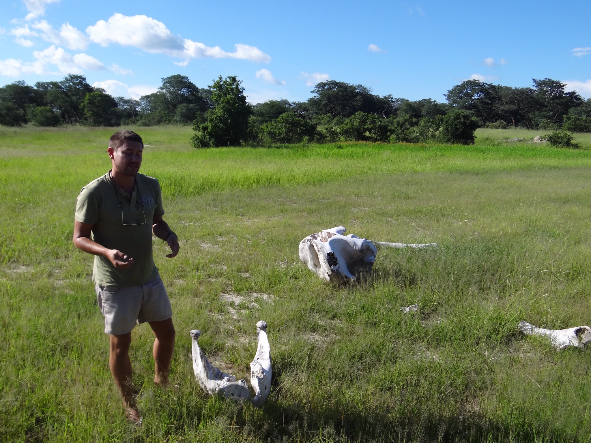Just when our hope was fading that this would be another disappointing excursion, the rain abruptly stopped and rays of sunlight started illuminating the landscape. The clouds all but disappeared and the sky was blue. Still, the bush was quiet except for a few birds, wildebeest and jackals. The guide demonstrated a traditional gummy plant that was used as an ingredient in soap. Rubbing a small amount of the sticky substance on your hands would elicit a lather and a pleasantly clean scent. Next we came upon a scattering of sun-bleached elephant bones that had clearly been there for years and our guide took this opportunity to get out of the vehicle and talk about elephant anatomy. Meanwhile, the rest of us were anxious to see some live animals.