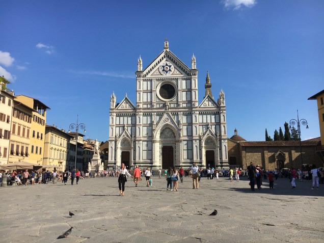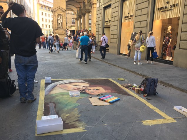 Several famous names all associated with the arts and sciences in Florence are entombed at Santa Croce Cathedral – Galileo, Michaelangelo, Dante, and Donatello (who was not only a Teenage Mutant Ninja Turtle! I won’t mention names but you know who you are!). During a flood in 1966, the entire cathedral was submerged in water and extensive damage befell the sanctuary, art, and tombs. Restoration work has been going on ever since. In a small work space near the cloisters, a single artist was surrounded by paint samples and brushes of all shapes and sizes while she was touching up priceless pieces of religious art one detail at a time.