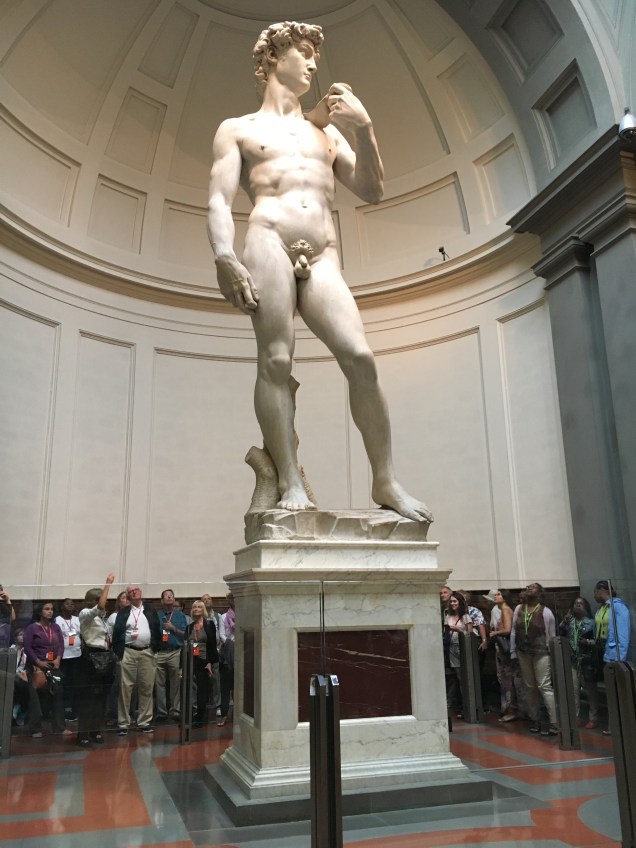 Back in Florence for one more day, I had yet to visit any of the famous galleries although the street art had been enough to pique my interest. As much as I may have tried in the past, I find most art doesn’t speak to me. I can’t appreciate it with the same zeal as true aficionados. I had so much as written off a visit to Uffizi until I learned that the first Sunday every month is free to all the city’s famous museums. An alarm set early, I decided I would go to the Galleria dell’ Accademia to view the David sculpture as soon as the doors opened. At least I had heard of the David and it would be FREE! The museum was only a 10 minute walk from my hostel, but I left 30 minutes to make sure I would be there plenty early. Still several blocks away, the heavy crowds were visible clogging the streets. No one else was out and about at that time on a Sunday morning. What I hadn’t considered is that the museum was….free. Who doesn’t love free stuff? Obviously! The line stretched for more than three blocks and took more than an hour to pass security and enter the main gallery. All told, it was well worth it. Even me, a hard-to-please art critic, was thoroughly impressed with Michaelangelo’s marble statue of David.