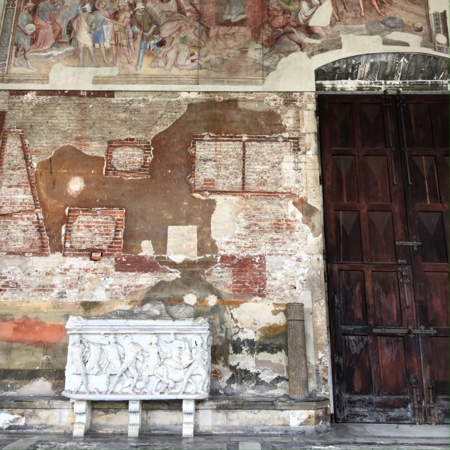 Siena had been so relaxing and special that perhaps another day trip would actually be good for me – tear me away from the wifi for a few hours….I made the mistake of choosing Pisa. Famous for its Leaning Tower, it’s a short train ride from Florence. My train was absolutely packed with tourists and I was already regretting it before I even arrived. I tried to go the opposite of the crowds, venturing in and out of the market streets and following an online guide to street art, but ultimately, I ended up in the same place as everyone else – in front of the Leaning Tower. A light drizzle had started to leak from the sky. I was more amused with the creative poses that tourists were emboldened to assume in front of the campanile than I was with the sight itself. It is more beautiful than I remembered seeing in photos and it is, in fact, leaning, but I couldn’t be bothered to climb it or to attempt any perspective photos myself. The adjacent cemetary, on the other hand, was almost vacant and held an eerie appeal that gave me a mild satisfaction in having made the journey in the first place.