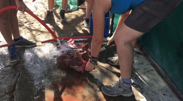 Sanna felt extremely uncomfortable inside the enclosure with seven drooling hungry cheetahs so the day that we returned for enclosure cleaning, she walked the perimeter making sure any warthog holes were filled in. Rachel and Tia stayed outside to taunt the cheetahs with more bloody carcasses while the rest of us snuck inside to clean up any bones and scat. I found it interesting that there were plenty of dried out cow patties that had been there several years before this enclosure had been built.