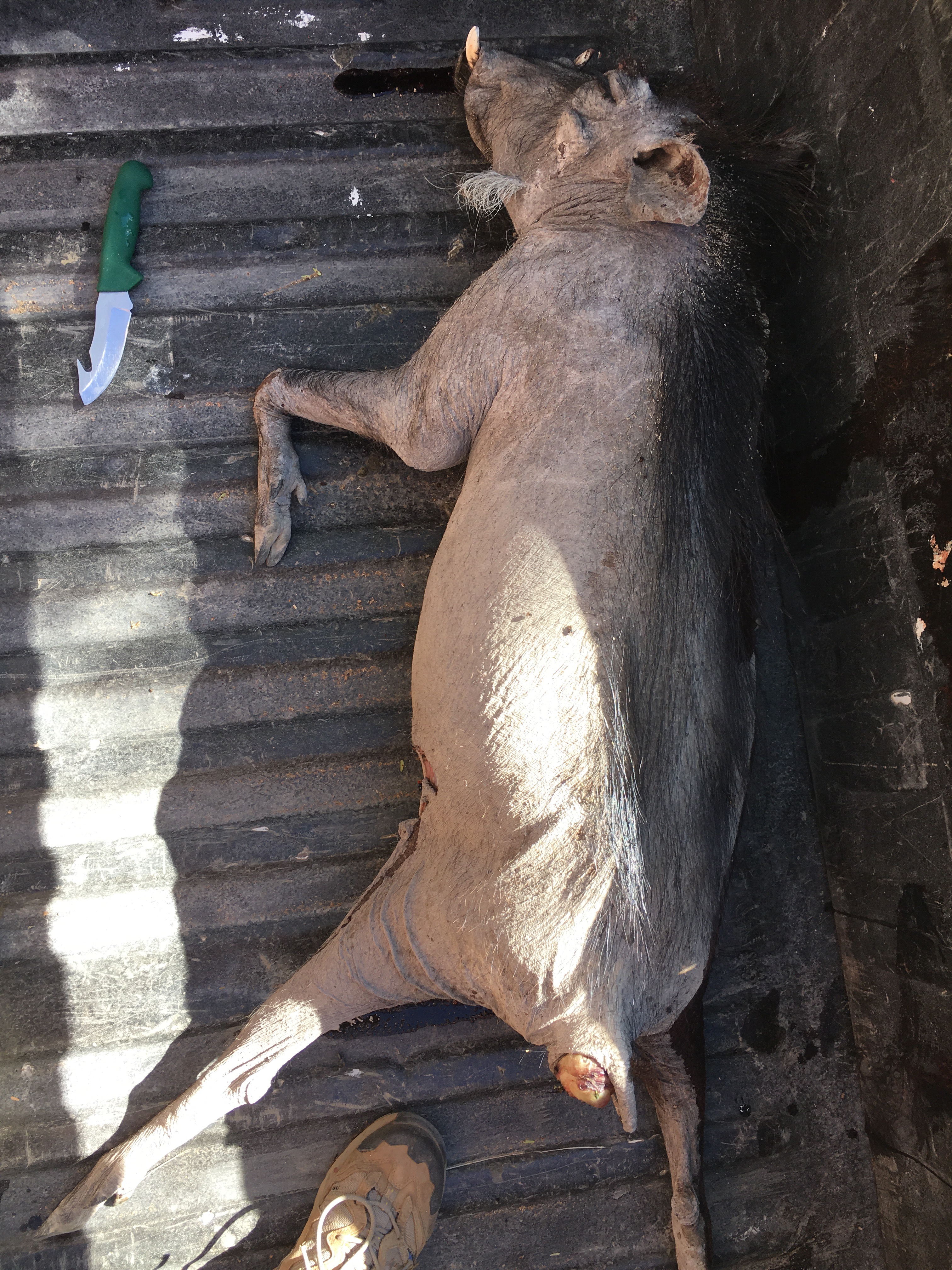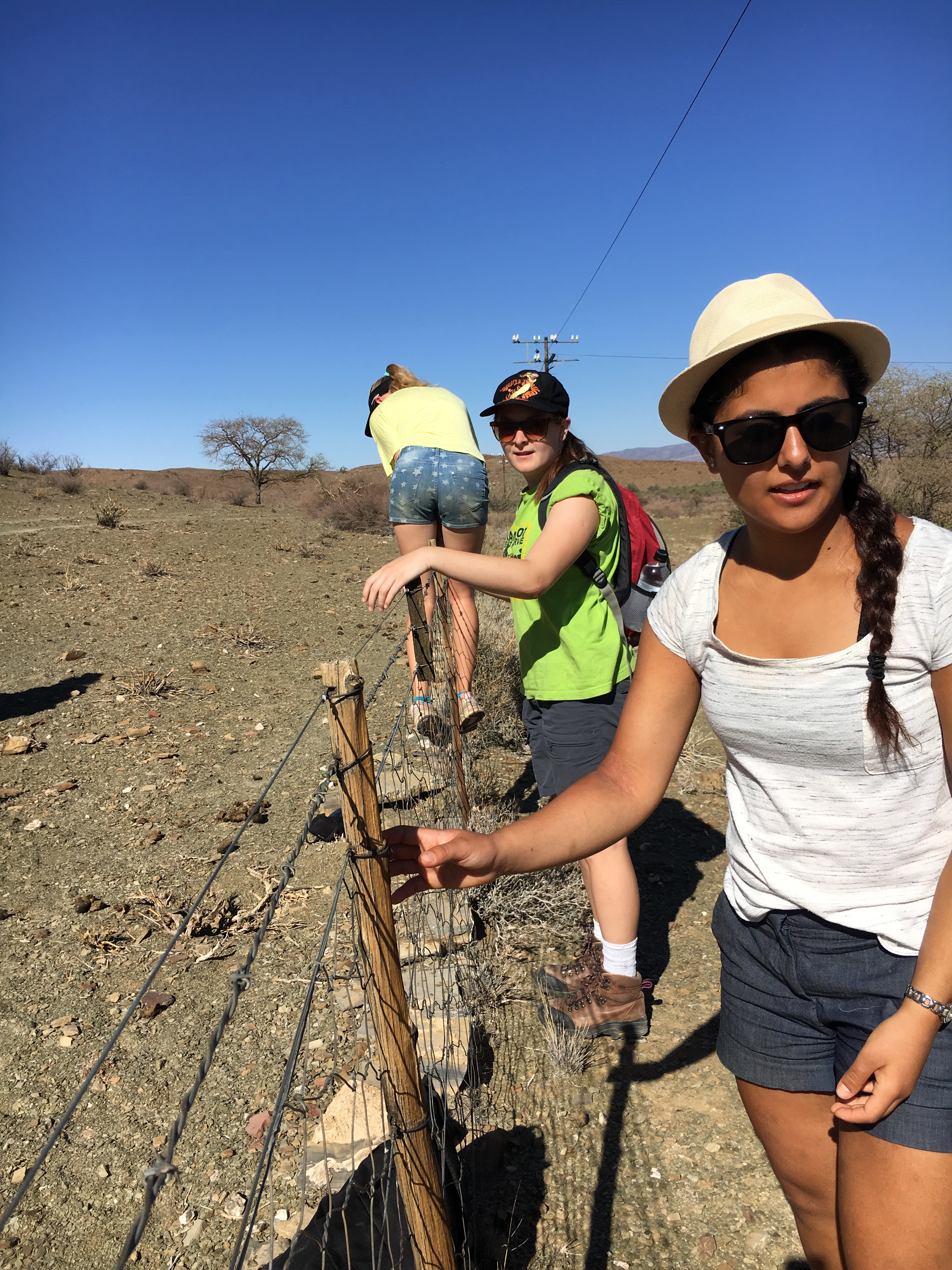 Almost immediately after our unrelenting drive from N/a’an ku se, Jeanette explained that we needed to capture a leopard which had been accused of stealing a farmer’s livestock. A capture cage had already been set by a previous team, but it was necessary to reset the bait. When you’re trying to attract a leopard, catnip won’t do. You need something bloody and smelly and of substantial size. An unfortunate warthog had become trapped in a barbed wire fence a day or so prior and had perished from her injuries. Her deathly aroma was only just beginning to blossom so over the next few days she was to ripen in the hot desert sun in hopes of attracting our leopard. Noor, who plans to study medicine, volunteered to do the dirtiest work. She had to slice the warthog from sternum to bowel to release all of the innards before the creature was then tied to the back of the buggy, bouncing along behind as we drove so as to create a fragrant trail of guts all the way to the cage. The bait was complete only after Rachel wrapped a wire around the tusks and back legs to fold up a warthog package for easier handling. Subsequently, we pushed her inside, reset the trigger mechanism, and resolved to be patient.