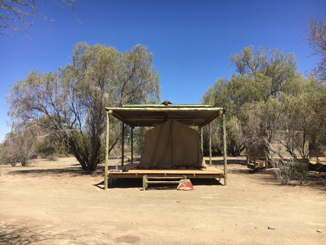 We would be sleeping in a semi-permanent tented camp on elevated platforms. Each was equipped with a front porch, a dressing area and two twin beds with surprisingly indulgent mattresses (too bad my wake up call averaged 4:00am everyday!). We had battery-powered lanterns and thick wool blankets to ward off the chill that crept in as soon as the sun disappeared. Open-air bathrooms were shared between two tents. I especially liked the post-sunset shower so I could ogle the stars that reached the horizon on all sides. Locks on the tents were unnecessary, although baboon sightings were common so it was imperative to keep any edibles in a locked cabinet. I ate a vegetarian diet while in Namibia, but the meat eaters dined on oryx or ostrich that had been hunted by the estate’s staff.