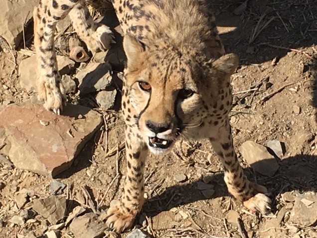 Jeanette would drive our buggy to the cheetah enclosure while the volunteers would stand in the back. On instinct, the felines would see us coming and run alongside. Usually, we would greet them at the front gate and toss their feed from the safety of the gate, but on one occasion, we drove inside to a small wooden feeding platform about 100 meters from the entrance. These cheetahs had all been wild once and had taken to killing livestock (the easy prey) so they were perhaps the most dangerous type of cheetah to us humans (extremely easy prey). We held them at bay using long sticks while we climbed the steps to the platform. Unfortunately, cheetahs are not the smartest of cats so a stick seemed to be enough of a defense. Their specialized binocular vision, which is meant to spot prey from a long distance, proves to be very poor when faced with close up targets. We each had to hold a piece of meat, make sure our designated cheetah saw it, and throw just when they could follow the arc to know where it landed. In the cases where the cheetahs didn’t see the bloody dripping animal part land on the ground, they couldn’t find it on their own using their eyes or nose. We then had to toss small stones at the meat so that they could find it. I found it remarkable to see how their senses would fail them.