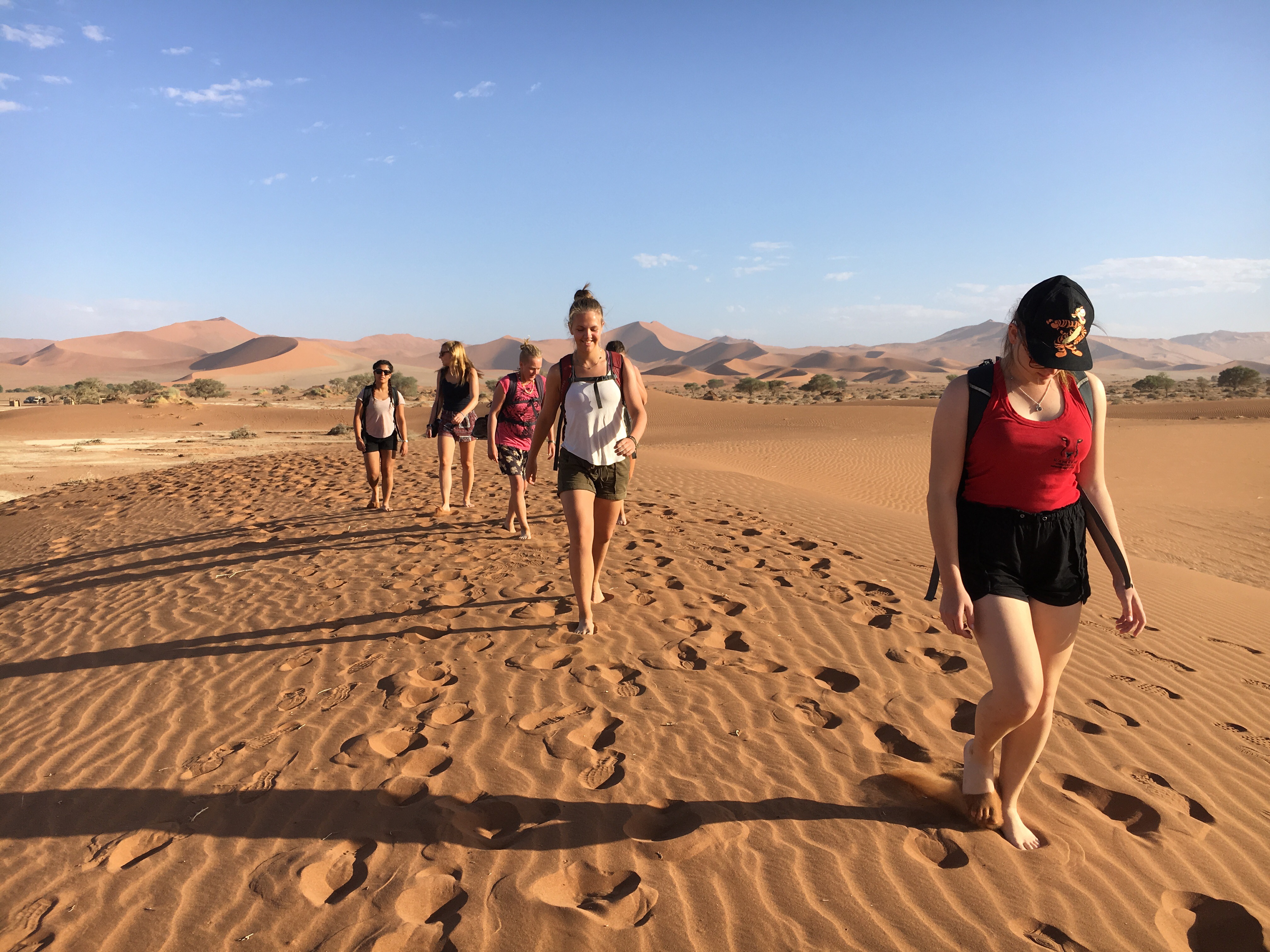 Our time at the lodge wasn’t all work, though. One day, Jeanette drove us to Sossusvlei to climb Dune 45 (Big Daddy) and to admire the salt pan at Deadvlei. The day started with a flat tire before the sun had even risen, but once we saw the dunes peeking above the horizon, you could feel the excitement buzzing like electricity in the van. While it’s highly unnecessary, many tourists in Namibia get around by overland truck tours so I consider us extremely lucky that on the day our small band of volunteers visited, it was also an off day for the overlands. The place was virtually empty. It doesn’t look so daunting from a distance, but propelling ourselves up the epic Dune 45 was no easy feat. Head down, one foot in front of another, mind over matter…one by one all of the volunteers made it to the top. The vista was a sea of sand and it was all ours. We had walked up barefoot so it was important that we leave the summit no later than 9:30am or else the sand would be too hot on our feet before we reached the bottom. Noor, Seraina, and Rachel practically dove in headfirst as we tumbled through the sand. One leap and a cushion of sand could catch you a few meters farther downhill.