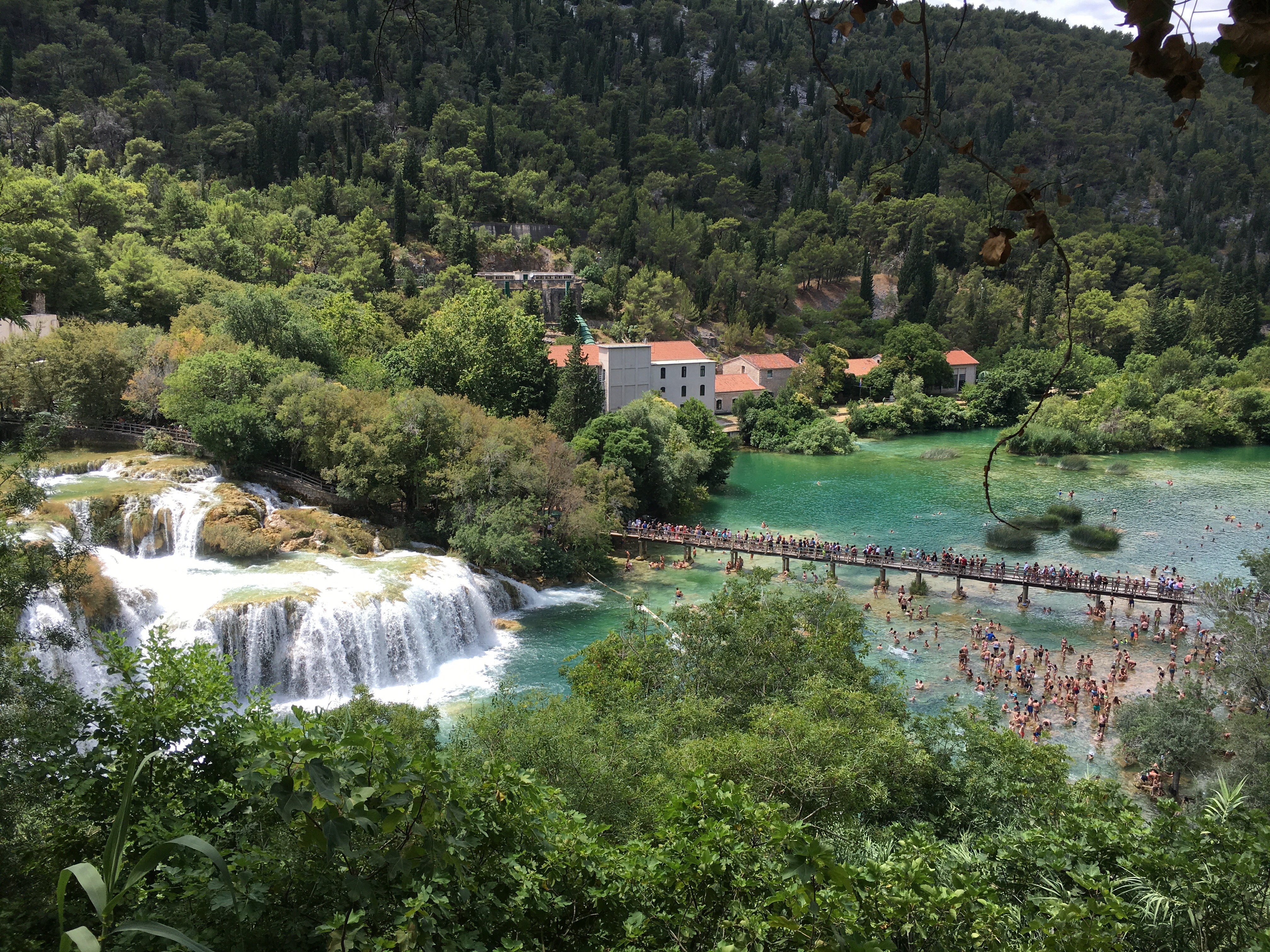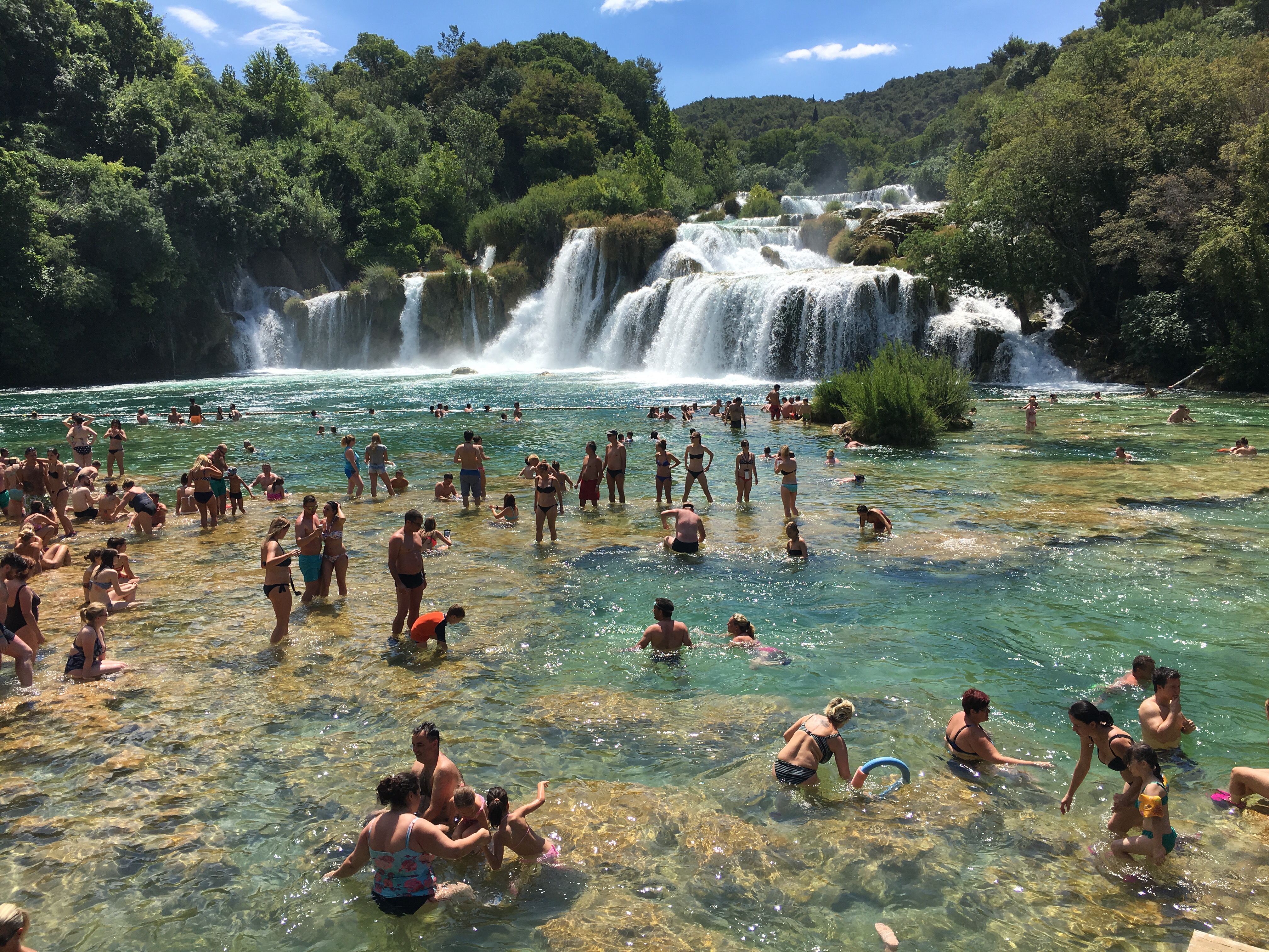 Krka is within a one hour’s drive from both Split to the southwest and Zadar to the northwest. I booked a bus ticket to Skradin, the entry point of the park, and for some reason, was surprised with the mobs of bodies that were already milling around the park entrance. Like Plitvice National Park that I had visited a few weeks earlier, Krka is also home to some breathtaking waterfalls and nature paths that allow you to explore the park. The biggest difference between the two is that in Krka, there is a zoned area where swimming is permitted. And if I’ve learned nothing else in my travels around the world, it’s that people LOVE swimming in waterfalls. Big ones, small ones, blue ones, green ones, tall skinny ones, and short wide ones….it doesn’t matter. People love it. It helps when the temperature is soaring above 30 degrees C, but they will go in no matter what the weather. So that leaves me wandering exactly why I was surprised to see so many darn people!