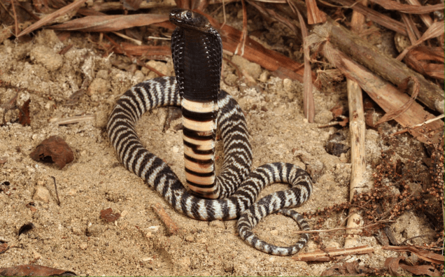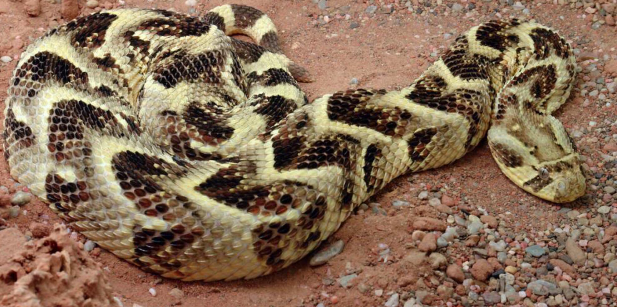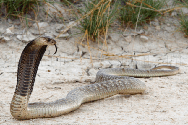 Puff adders are nocturnal and are tan and gray in color with a chevron pattern in black along the length of body with a triangle-shaped head. They have the longest fangs and are the fastest striking snake in Africa, but at the same time, they tend to be very calm and relaxed and don’t strike unless imminently threatened. Their venom is cytotoxic in nature, causing severe swelling, pain, discoloration, blistering, compartment syndrome, gangrene, and in extreme cases, amputation is required.