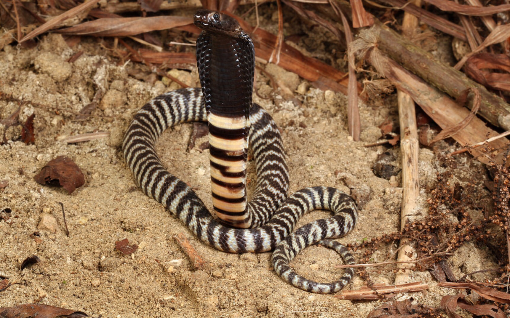 Anchietas cobras can be either brown or banded with black and tan stripes. They are diurnal and territorial, living in abandoned termite mounds or burrows, inflicting a neurotoxic bite when so inspired causing descending paralysis from the eyes, lips and tongue down to the heart and cardiac arrest. And alternatively, the zebra spitting cobra is black and white striped with a black head and causes the majority of bites in Namibia. They can spit venom as far away as 3 meters and have been known to go into houses to find shade, but then, being nocturnal, bite people while they are sleeping, often on fingers or toes that may drape off the side of the bed. Francois, always the snake apologist, has a theory that these are cases of mistaken identity and those appendages could have been prey. This one also delivers a cytotoxic punch when just one week earlier, a girl of only six years old had three of her fingers amputated after a zebra bite.