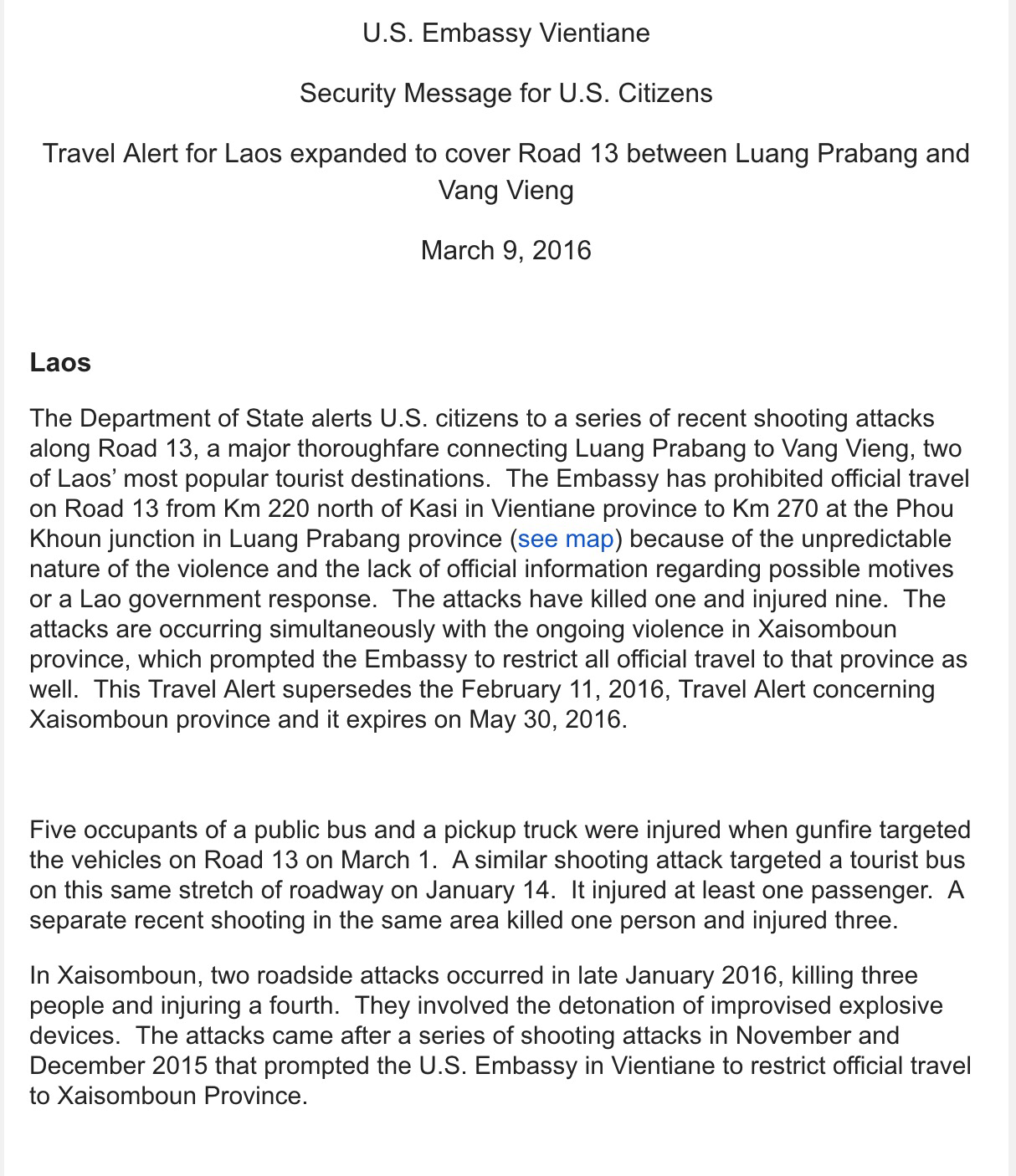 Most travelers to Laos stick to the obvious places – Vientiane, Vang Vieng, and Luang Prabang. Unknowingly at the time, I took a minibus on a route between Vang Vieng to Luang Prabang that had seen sniper activity directed against the Chinese in retaliation for a Chinese business venture to build multiple dams on the Ou River only one week earlier. On March 9, I received a notification from the US State Department to avoid this area after a shooting had happened on March 1 and others in November, December, January, and February. Considering I made the journey on March 6, I was a bit alarmed to learn that it took 9 full days to be notified.
